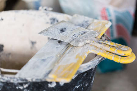 Two trowels standing on a concrete floor leaning on a black plastic bucket. Empty paper bags of plaster are lying in the background. Room renovation concept