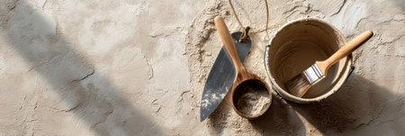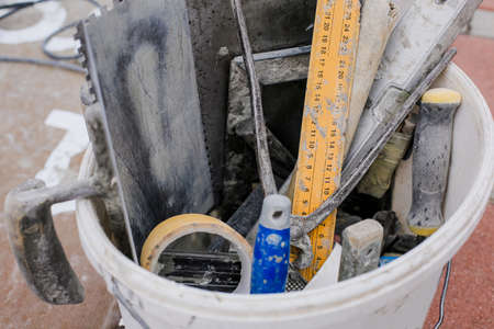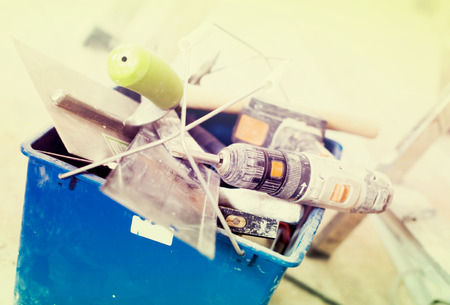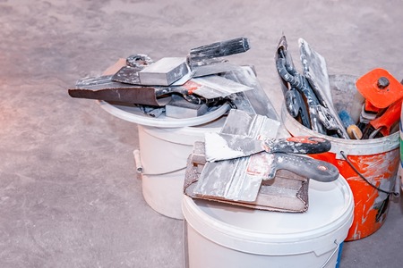 Set of plaster trowel tool, spatula and bucket. Construction tools in empty room