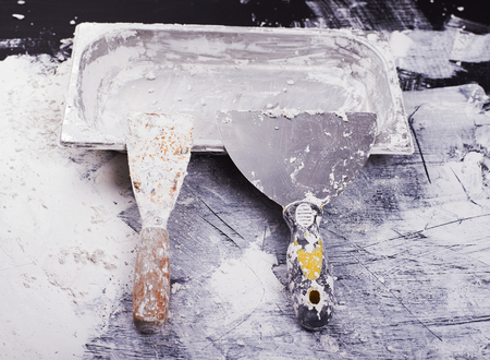 Select the color of paint for the walls. Old tools for painting and putty walls and backgrounds. Making background.