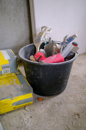 Plastering trowel mixed cement in a bucket on the floor in construction site