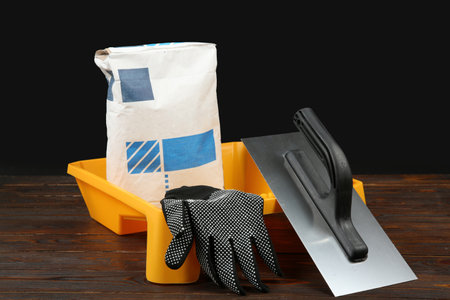 Bag of cement powder, tray, putty knife and rubber glove on wooden table. Building materials and construction tools
