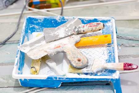 Finishing tools. Brush paint and steel plate spatula used for putty and paint on the floor.