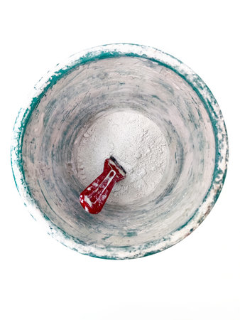 Spatula is placed inside an old plastic bucket. Process of manual mixing construction putty. Preparation for putty work. Close-up. Copy space. Selective focus.