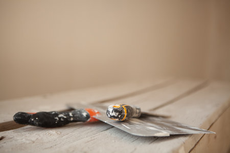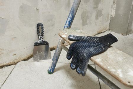 Dirty black work gloves and a spatula lie on the floor. The smooth surface is covered with a light putty. Background. Texture.