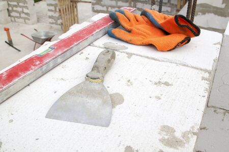 construction level, spatula and orange gloves are on the foam blocks on the construction of a country cottage