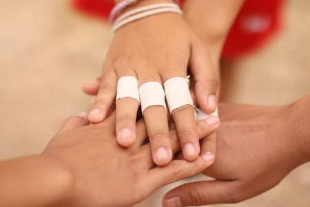 wound stuck with a plaster on a hand of the boy