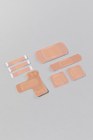 Set of adhesive plasters on white background. First aid and home help