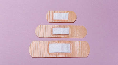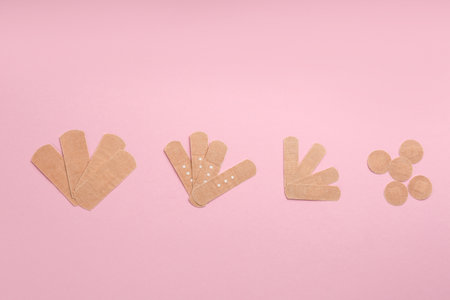 Different medical plasters on pink background