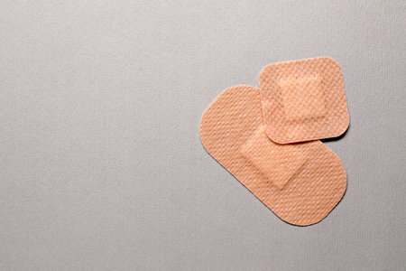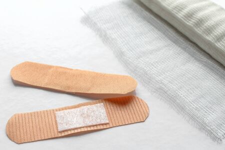 Adhesive bandages and bandage on a light background. Professionally photo with place for text. Medicine