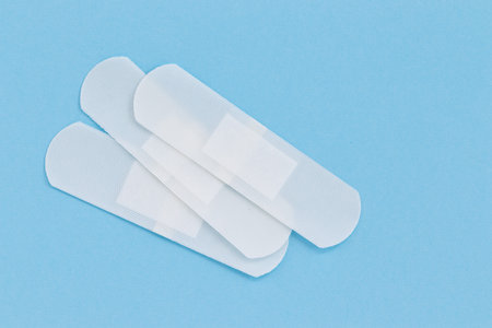 Medical Adhesive bandage plasters on blue beige background