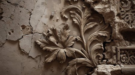 An ornate stone wall presents repeating floral patterns in bas-relief. The warm beige tones are highlighted by sidelight, enhancing the textures and details of the carved elements. This architectural design could be used in projects related to art, design, or historical themes, offering a visually rich background.