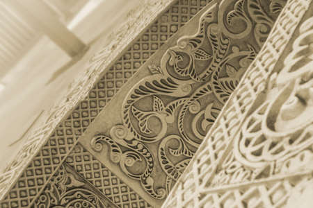 Elaborate columns display detailed relief carvings with golden embellishments. The repetitive pattern and texture are highlighted by the overhead lighting, creating a captivating visual effect. The design suggests an architectural detail of a historical building, suitable for illustrating cultural heritage or design concepts.
