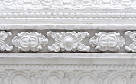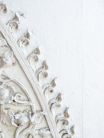 A close-up of a white stucco mural on a temple wall in Thailand, showcasing traditional, intricate floral and ornate patterns with natural light and shadow.