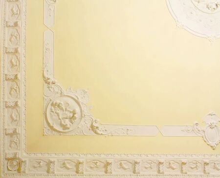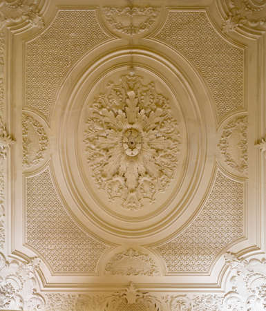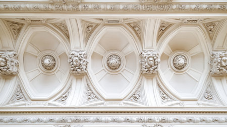 This photo showcases a stunning architectural ceiling adorned with intricate reliefs and detailed moldings, embodying classic elegance and timeless beauty in interior design.