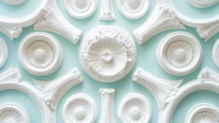 This image showcases elegant white plaster decorations mounted on a soft blue wall, featuring intricate floral patterns and classic design elements that enhance any interior space.