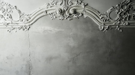 This image showcases an elaborately carved vintage wall molding with floral details, set against a subtly textured gray background, ideal for design inspiration.
