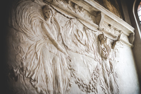 Intricate stone carvings and decorative elements embellishing the facade of a historical structure, showcasing architectural craftsmanship