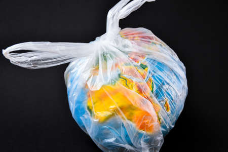 ball in the form of a globe is in a plastic bag. concept of plastic pollution of the earth. World Environment Day concept.Toy world globe in white plastic bag. Copy space for text. Save Earth