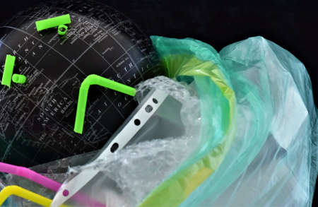 a globe in a plastic bag in a pile of plastic waste