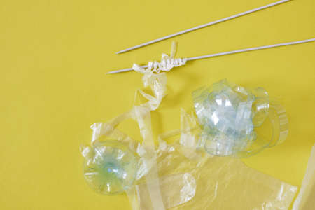 yarn from recycled plastic concept, knitting needles, tangle of chopped plastic on green background, essential environmental protection concept from pollution plastic waste