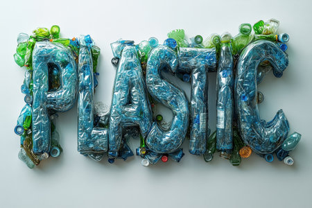 The word plastic is formed using colorful recycled plastic bottles in various shapes and sizes. This artwork emphasizes the importance of recycling and environmental awareness.