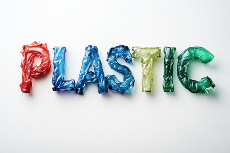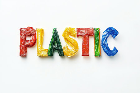 Brightly colored letters made from plastic arranged to spell the word plastic against a clean, white background. The vibrant colors highlight the material and its versatility in art.