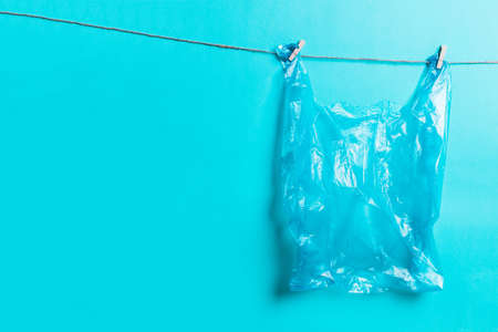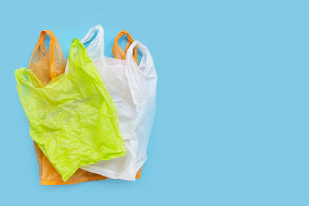Colorful plastic bags on blue background. Copy space