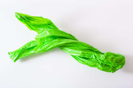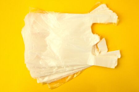Yellow plastic bags isolated against a white background. No plastic bags. Environmental pollution by disposable bags, recycling.