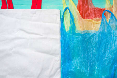 Eco natural reusable tote bag for shopping versus plastic bags. Flat lay on wooden rustic background. Sustainable lifestyle concept. Zero waste.