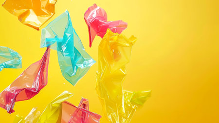 Vibrant plastic wraps in bright colors float against a yellow background, capturing a playful essence and creative spirit. Perfect for art lovers and design inspiration. Generated A.I.