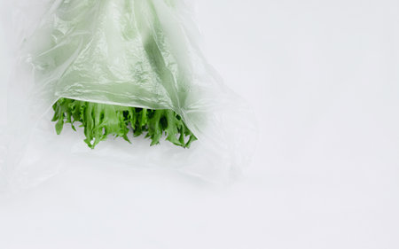 Raw lettuce from local market in plastic shopping bag over light background. Copy space. Top view. Organic food, edible fresh picked. Plastic Pollution, Ethical Consumerism, Healthy Eating concept.