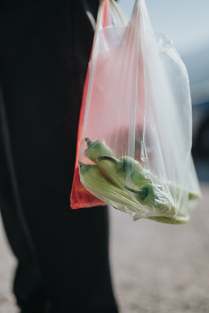 A closeup shot of a person holding a grocery bag