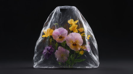A vacuum-sealed bag contains vibrant flowers, showing their beauty while emphasizing a unique way to preserve freshness and elegance in a simple display.