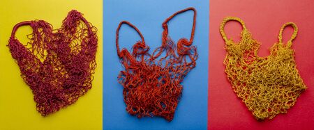 Empty reusable shopping string bag on different color background