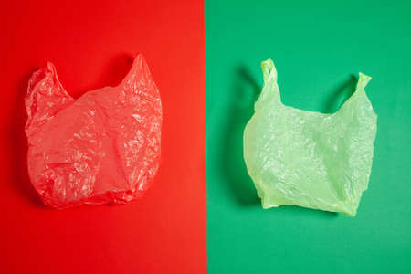 Crumpled plastic bags on red and green surface