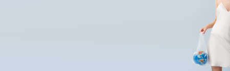 horizontal crop of woman in silk dress holding plastic bag with globe isolated on gray, ecology concept