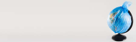 earth globe packed in cellophane bag isolated on gray with copy space, ecology concept, banner