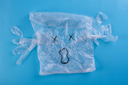 White plastic bag on blue background. Copy space