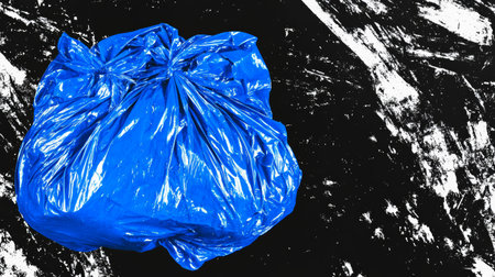 Abstract Blue Garbage Bag on Contrasting Black and White Textured Background.