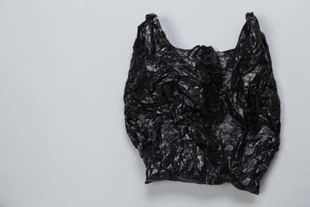 close up of used black plastic disposable bag on gray background