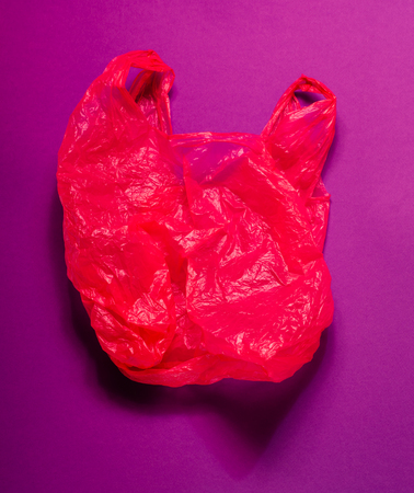 Red shiny plastic bag on purple background. Bright background.