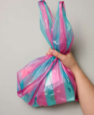 female hand holds full plastic bag on gray background, top view