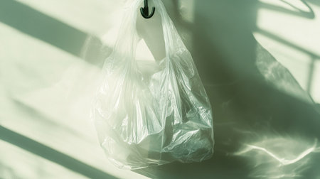 A single clear plastic bag with visible creases hanging on a hook, bathed in natural light