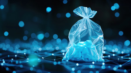 A clear plastic bag filled with crumpled paper sits against a vibrant digital background of glowing blue lights. This image embodies modern environmental themes and the importance of waste management.