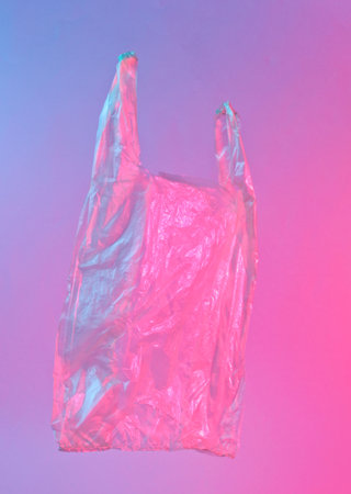 Minimalism pollution ecology concept. Crumpled plastic bag in neon red blue light