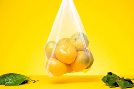 Plastic free lifestyle concept. Fresh ripe tangerines in reusable eco friendly mesh bag hanging on yellow background. Zero waste shopping concept.