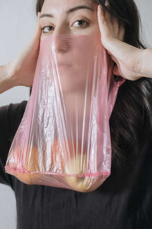 unhappy female with plastic bag on her head against blue wall studio