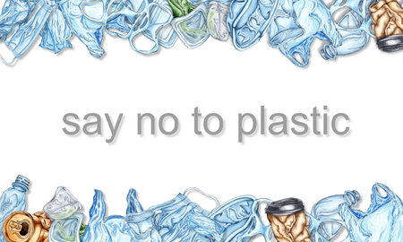 Watercolor illustration frame plastic trash. Isolated on white. Polyethylene waste border for ecology posters, environmental protection, save the ocean, Earth Day posters, web, banners