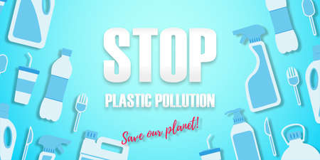 Stop plastic pollution poster. Disposable plastic in a flat style. Disposable bottles, cans, spoons, cups, forks and knives. Flat lay. Ecological problem.