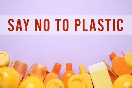 Text SAY NO TO PLASTIC and disposable items on lilac background, flat lay